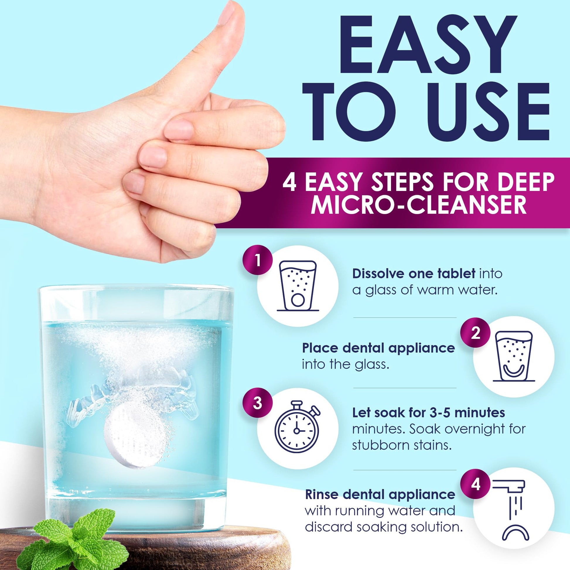 - FAST ACTION CLEANING IN 3 MINTUES – Achieve rapid and effortless cleaning by just dropping one tablet in any cup, dental pod, or retainer case with warm water and soaking for a quick and refreshing oral care solution in just 3 minutes.